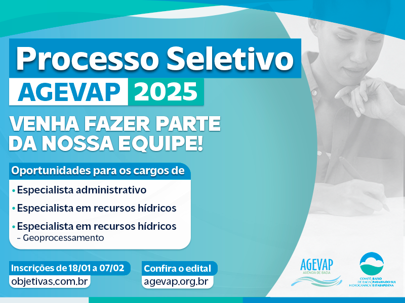 https://www.agevap.org.br/conteudo/edital-01-2025.pdf) da AGEVAP - Associação Pró-Gestão das Águas da Bacia Hidrográfica do Rio Paraíba do Sul, que é a secretaria executiva do Comitê Baixo Paraíba do Sul e Itabapoana, com o objetivo de preencher vagas imediatas e cadastro reserva (CR).